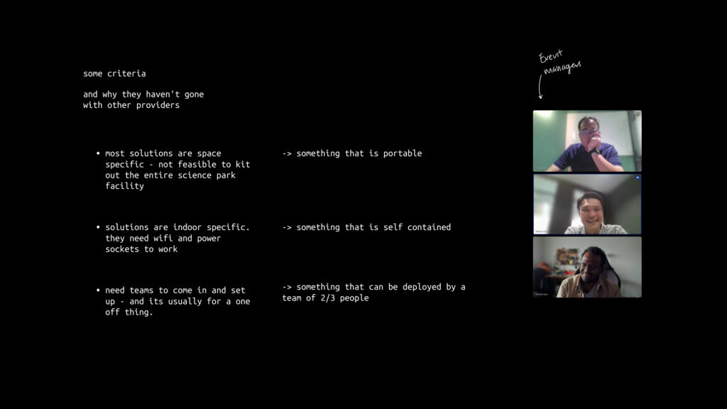 It was around this time that I got in touch with event managers at Science Park (Kent Ridge). After consulting them, I realized that running analytics for entire event spaces with individual sensor modules approach wouldn’t scale. Installing sensors everywhere, running power to each location, managing dozens of wireless modules wasn’t practical for their operations.