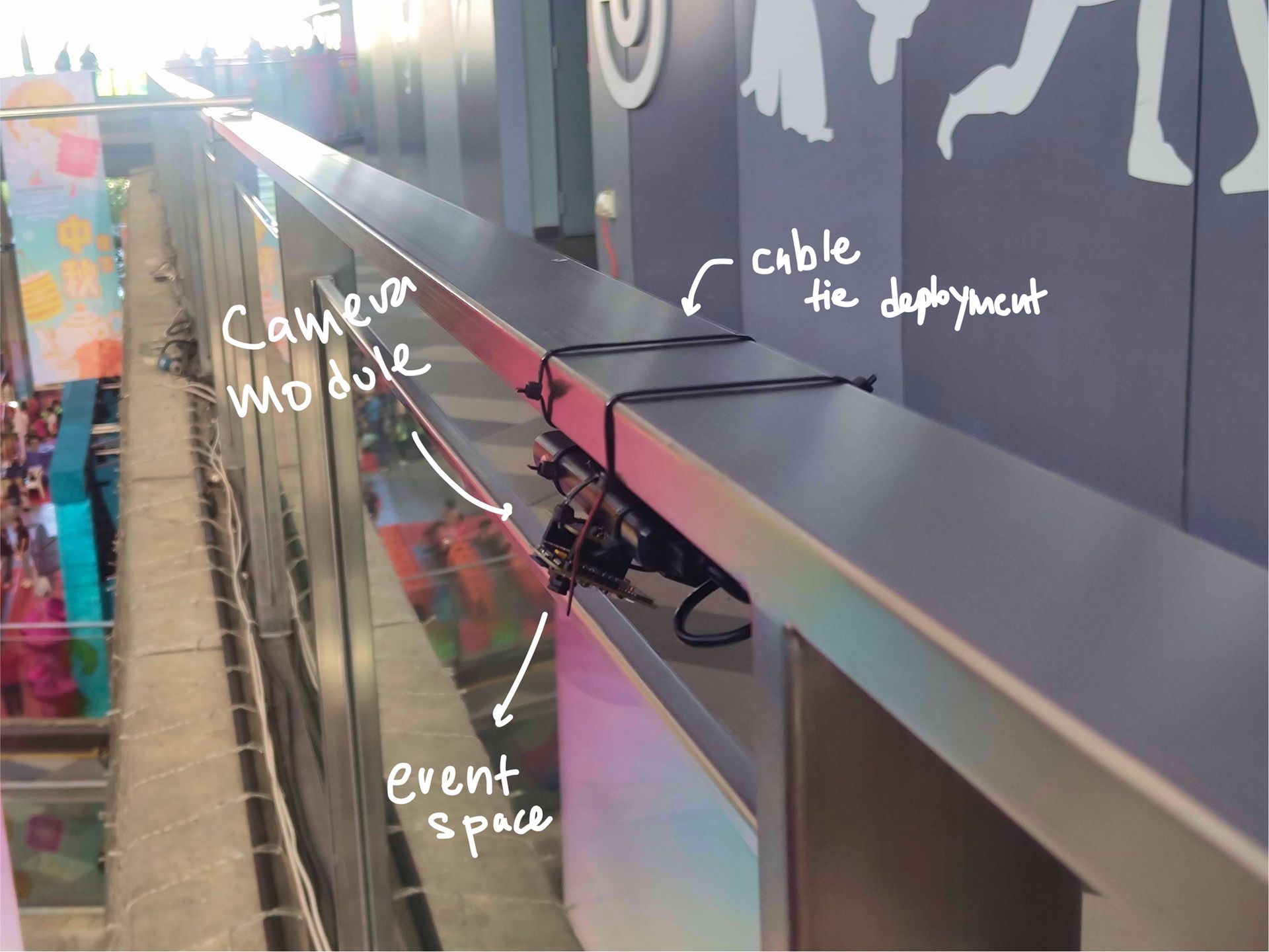 So I pivoted to using camera modules and computer vision models to extract behavioral insights in spaces. In an ideal world, this system can just plug into the security cameras in most places. However, I couldn’t get access to it (duh) so I whipped up a quick ESP32Cam-security camera and cabled tied it to railings to extract visitor info at exhibits. This setup was also deployed to test user data during the AIC Life Unstoppable Roadshow in 2025.
