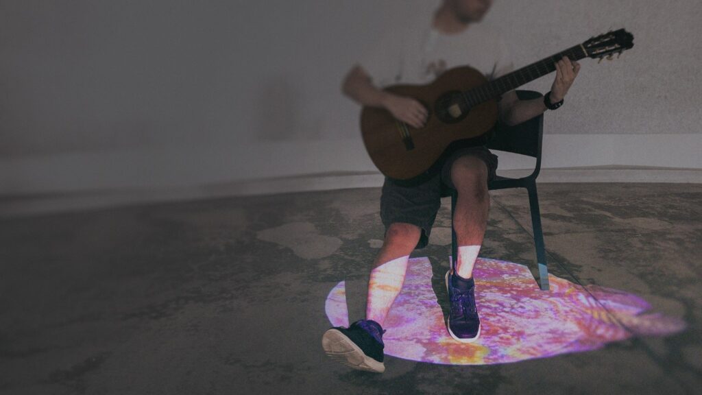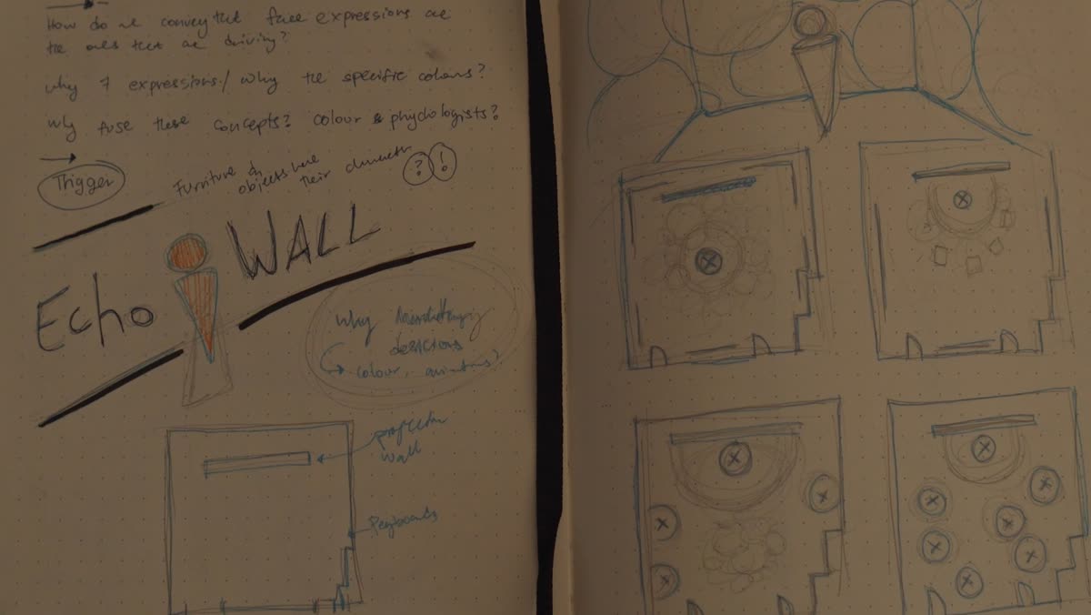 The brief required making something invisible legible across a shared physical space. The installation represents each visitor's emotional state as a coloured orb that drifts through the room, intersecting with the states left by previous visitors and building a collective picture of emotion over time.